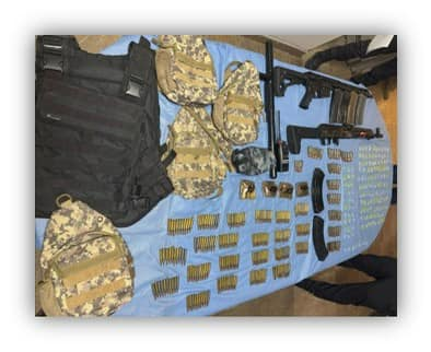 En el inmueble se aseguraron armas de fuego, equipo táctico y drogas, incluyendo un fusil AK-47, un fusil AR-15, seis cargadores (dos para AK-47 y cuatro para AR-15), 426 cartuchos útiles de calibres .223 y 7.62×39, 147 envoltorios de cristal, un chaleco táctico, mochilas, un radio portátil y un tolete PR-24.