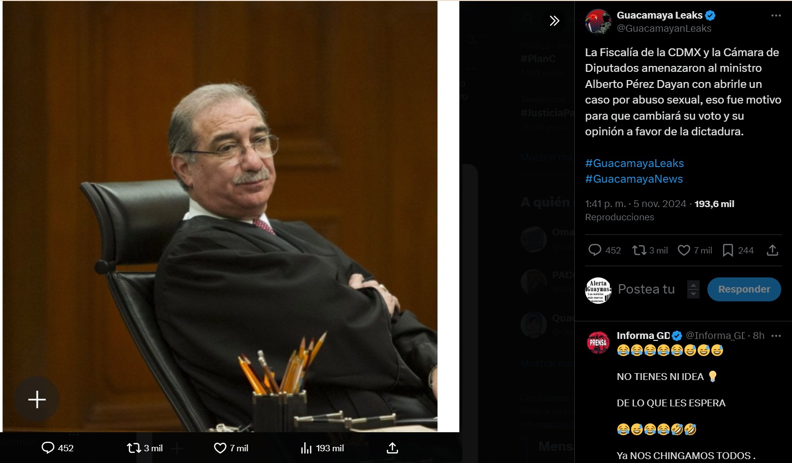 La organización Guacamaya Leaks denunció a través de su cuenta Twitter que La Fiscalía de la CDMX y la Cámara de Diputados amenazaron al ministro Alberto Pérez Dayan, con abrirle un caso por abuso sexual, en caso de no modificar su postura en torno a la inconstitucional Reforma al Poder Judicial.