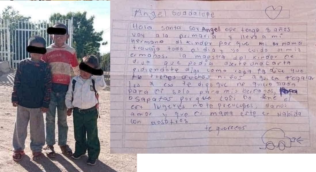 “Voy a la primaria y llevo a mi hermano al kínder porque mi mamá trabaja t0do el día y yo cuido a mis hermanos, la maestra del kínder me dijo que podía hacerte una carta pid¡éndote algo como ropa porque dice que tú tienes muchos n¡ños a quien regalarles, por eso te digo que no qu¡ero nada para mi, solo para mis herman0s, ropa o zapatos, danos amor y que mi mamá esté con nosotros”.